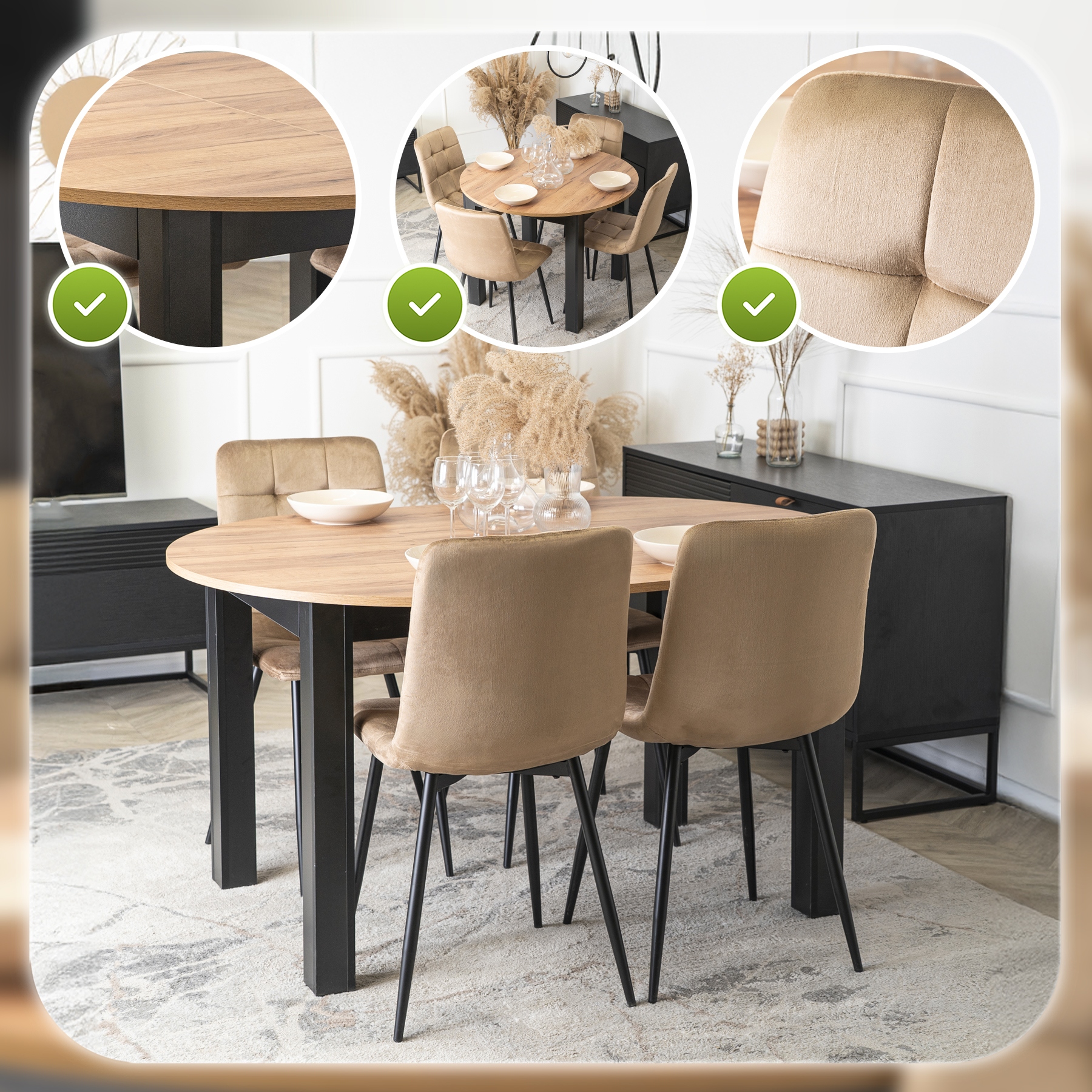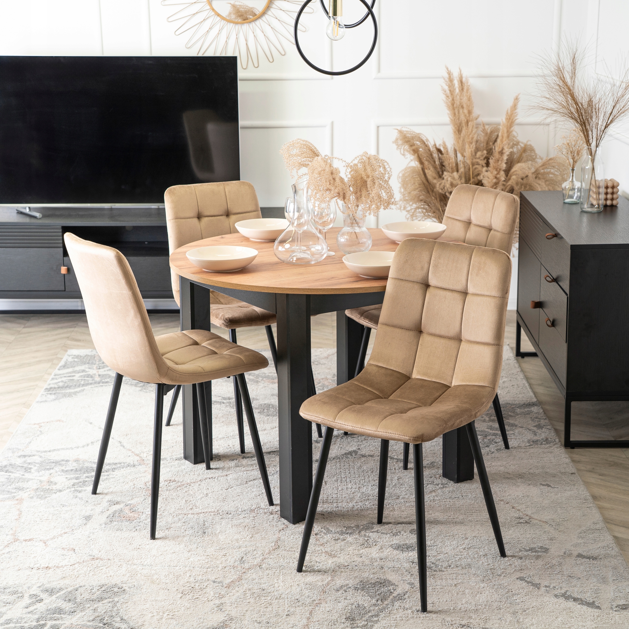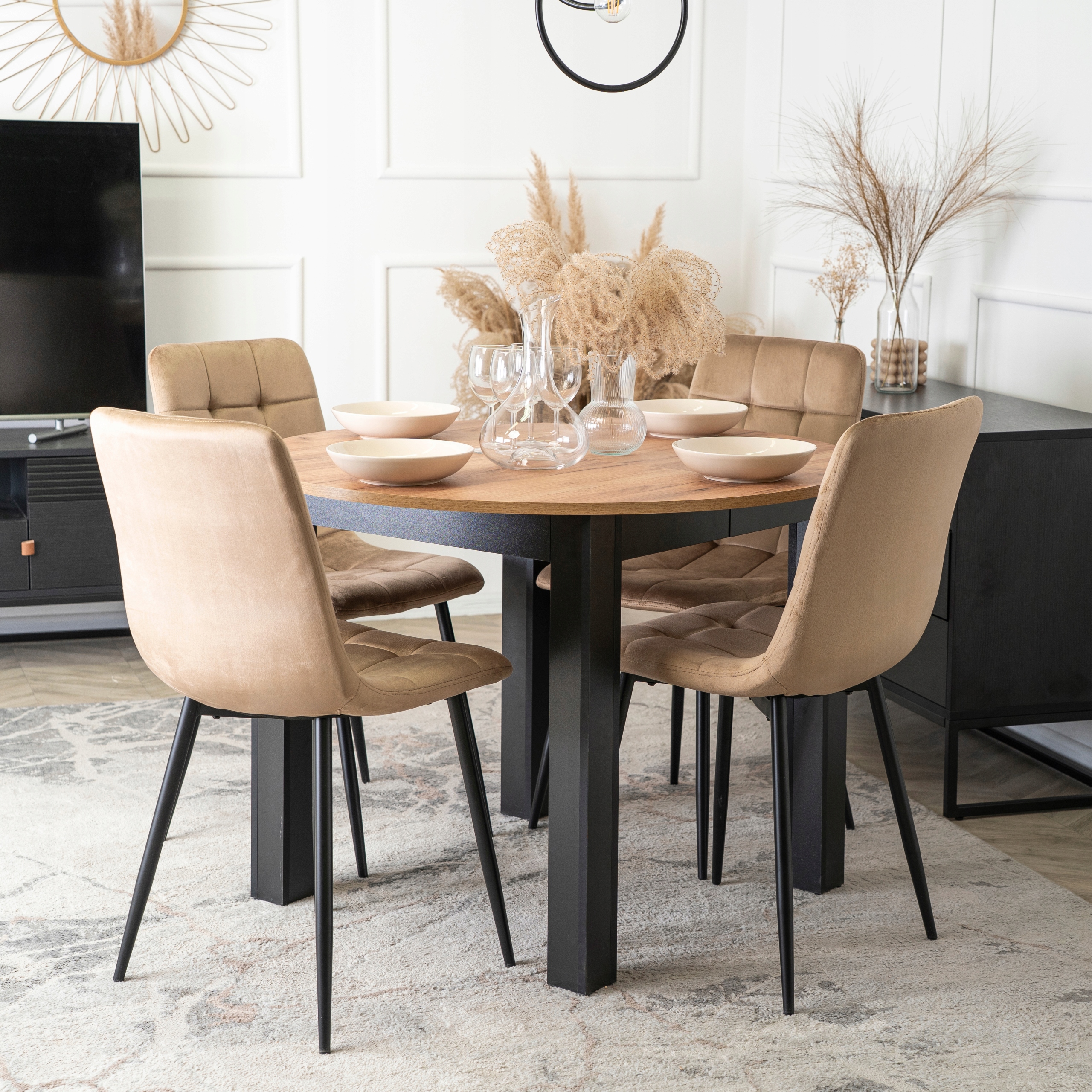 Zestaw składa się z okrągłego stołu w kolorze Dąb Craft oraz czterech krzeseł o welurowej tapicerce i metalowych nogach. Całość prezentuje się lekko, nowocześnie i elegancko. Dzięki klasycznym kolorom łatwo go dopasować do różnych aranżacji.