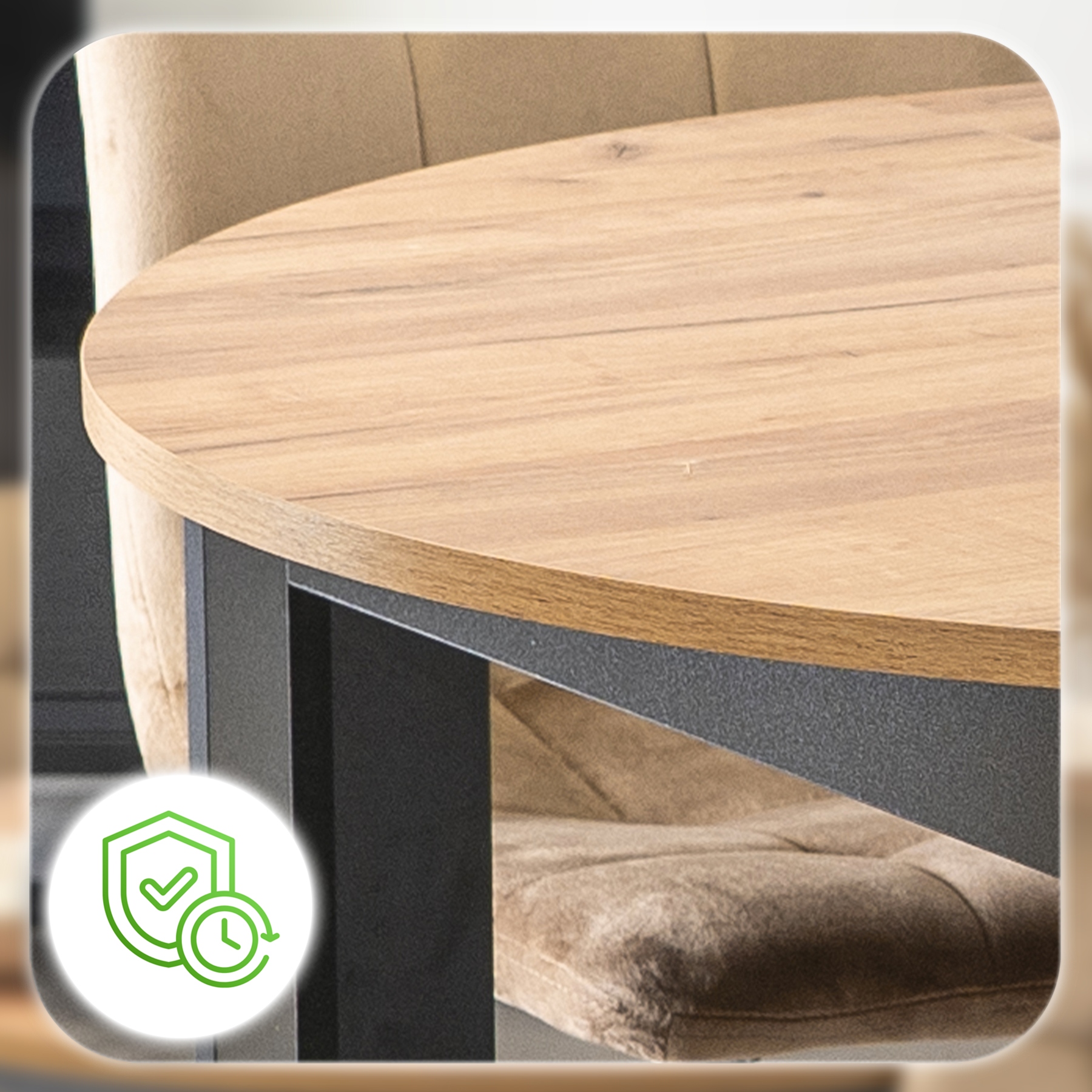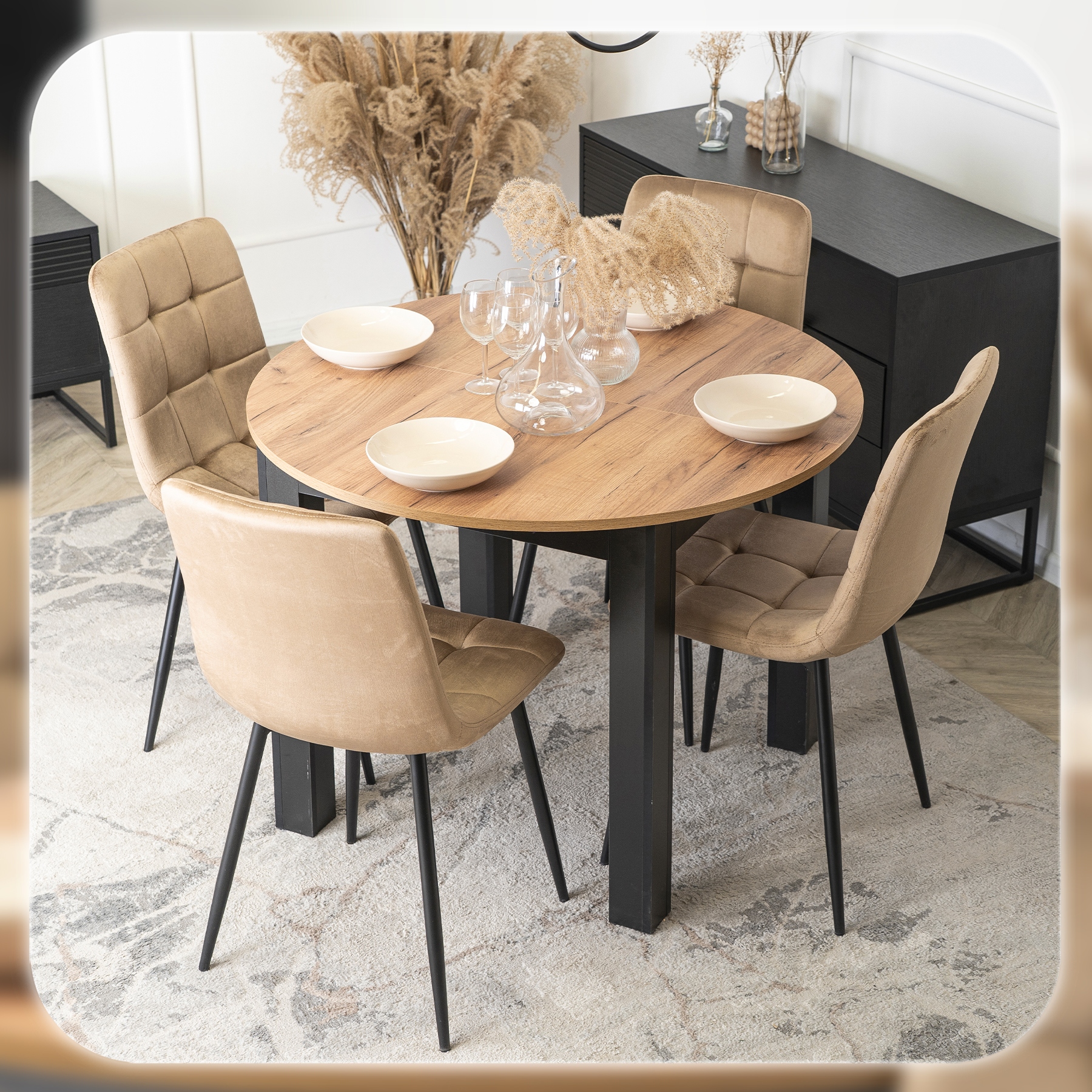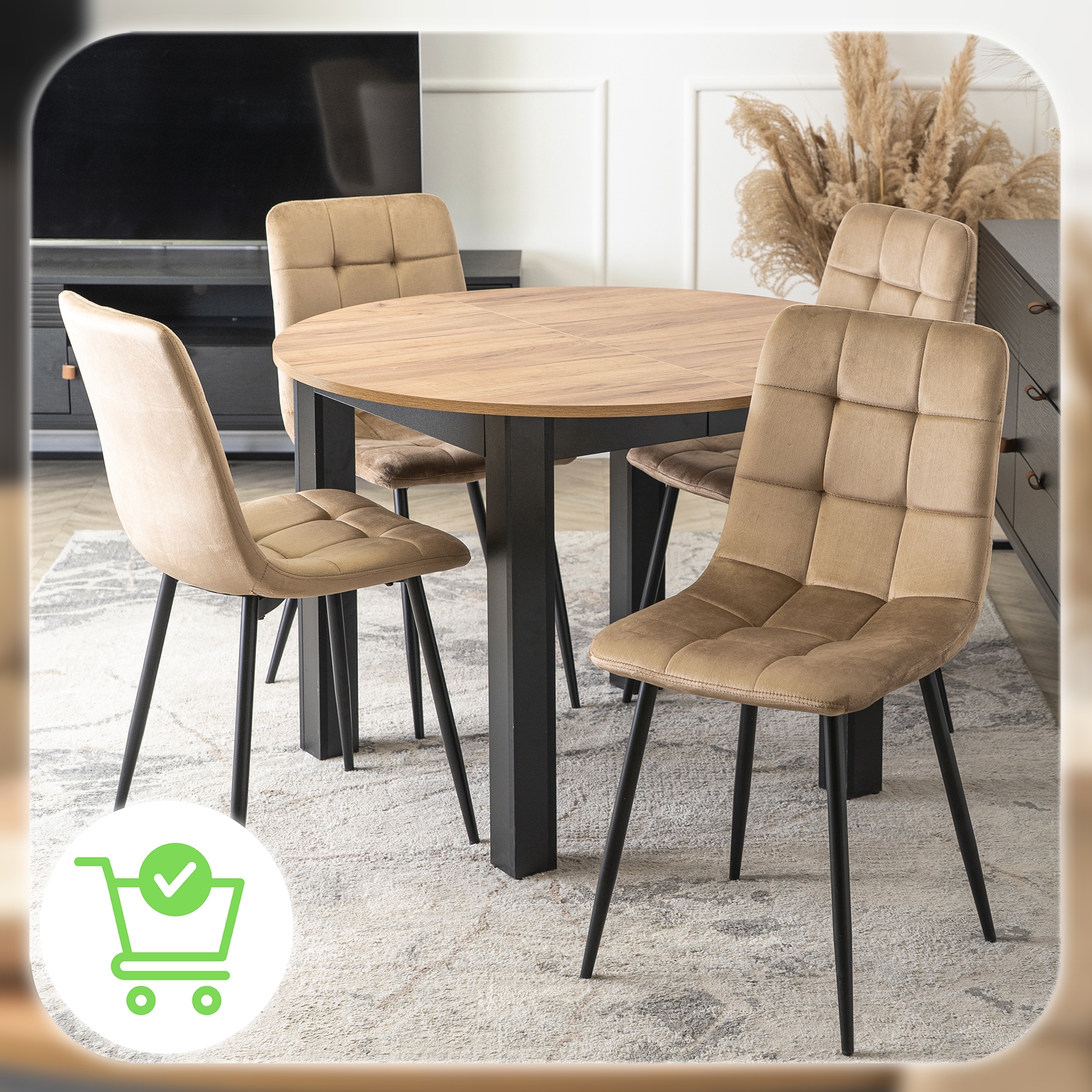 Zestaw składa się z okrągłego stołu w kolorze Dąb Craft oraz czterech krzeseł o welurowej tapicerce i metalowych nogach. Całość prezentuje się lekko, nowocześnie i elegancko. Dzięki klasycznym kolorom łatwo go dopasować do różnych aranżacji.