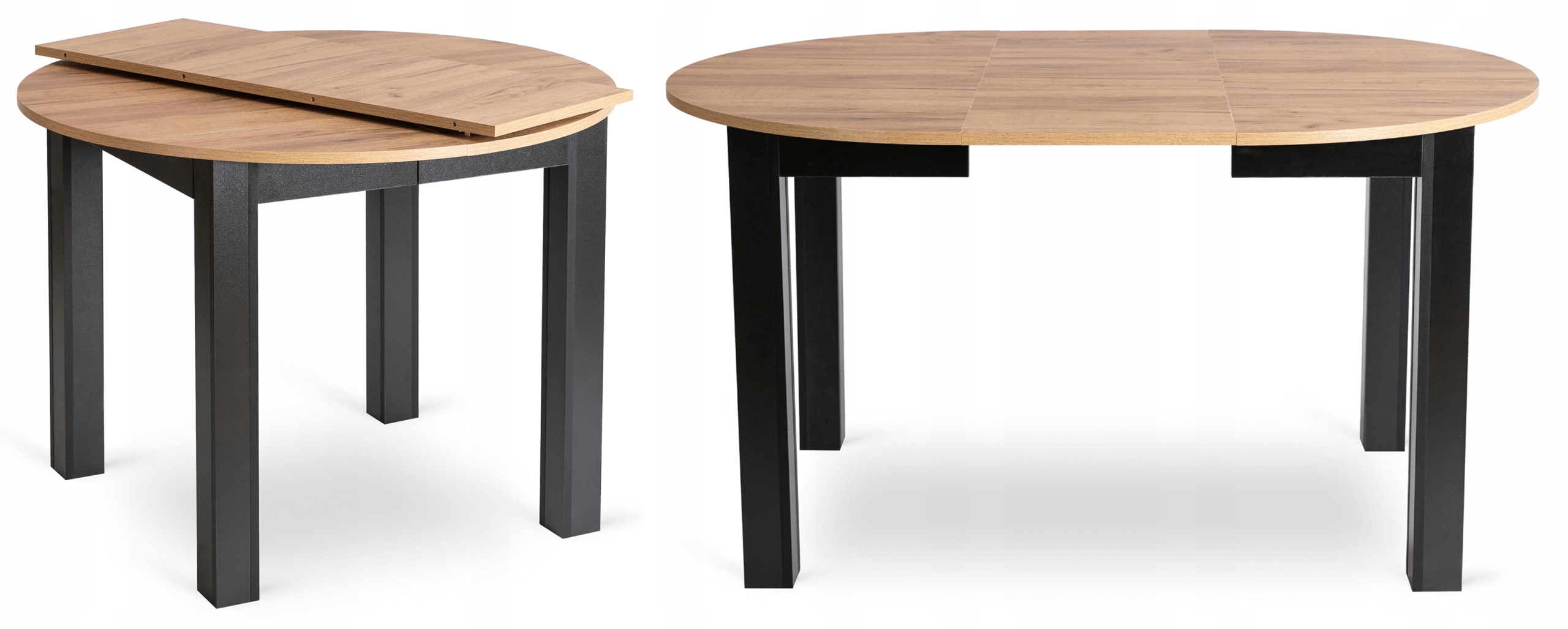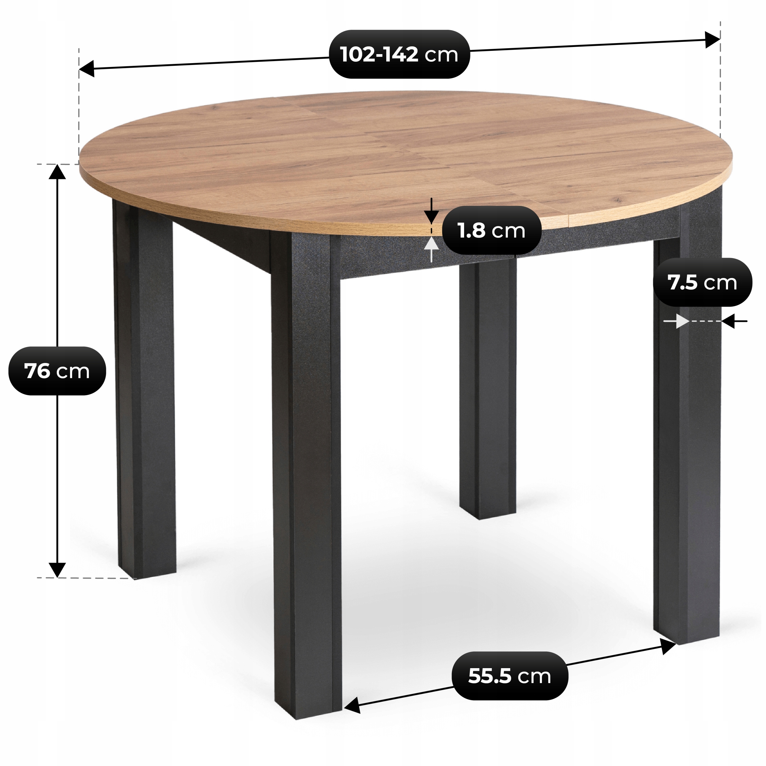- Stół rozkładany – okrągły blat możliwością rozłożenia z 102 do 142 cm długości.
