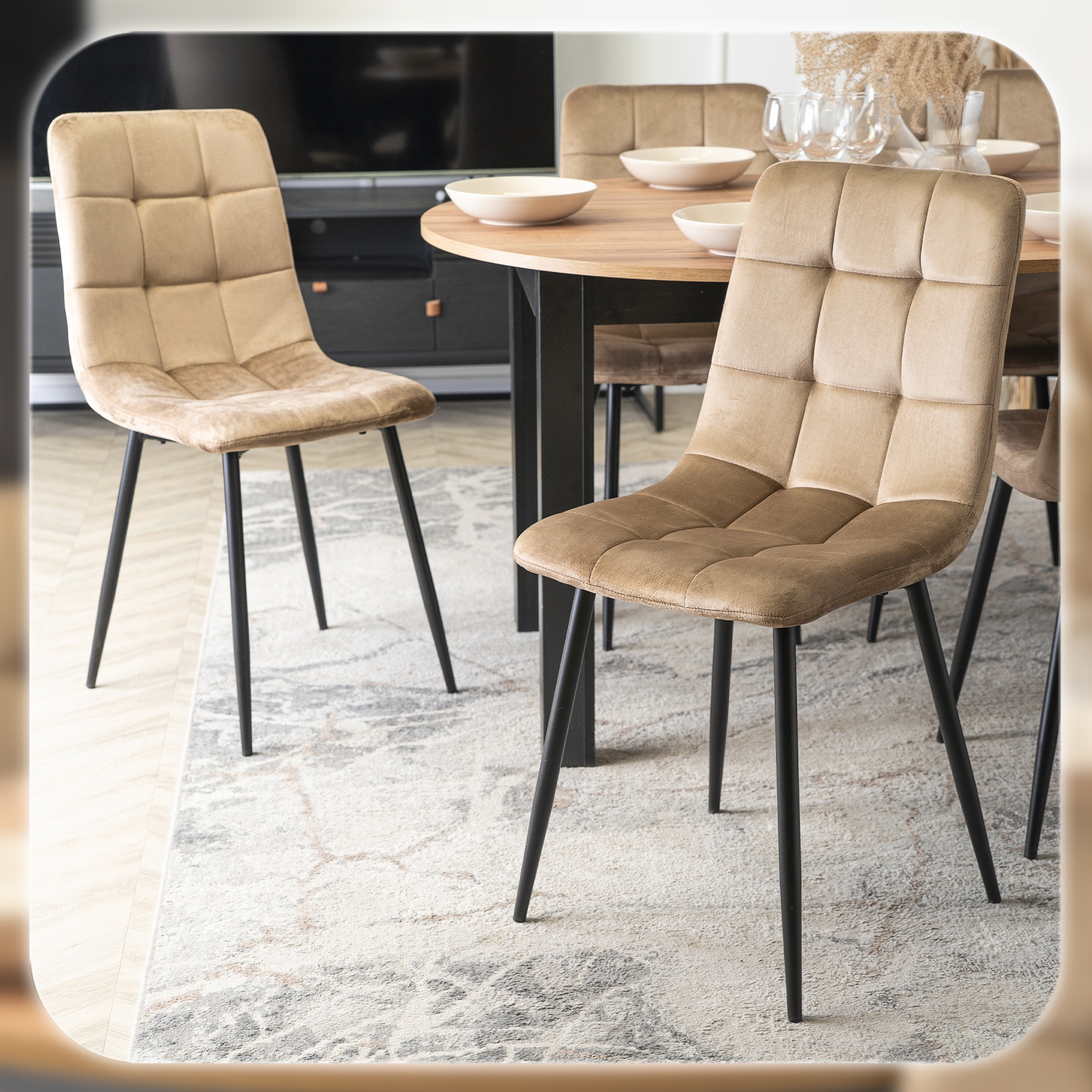 - Wygodne krzesła PERU – miękkie, welurowe w beżowym odcieniu gwarantują komfort siedzenia nawet podczas długich spotkań przy stole.