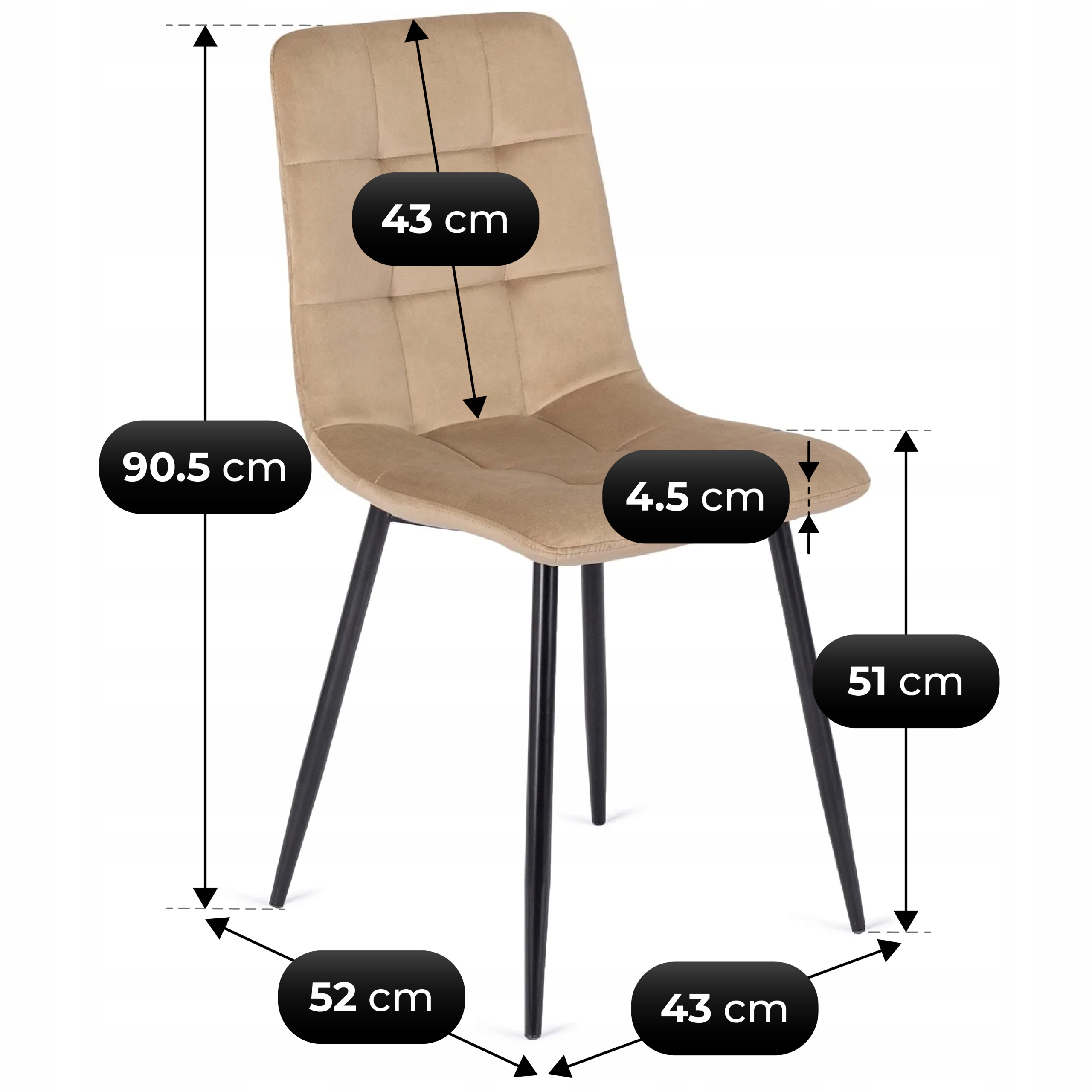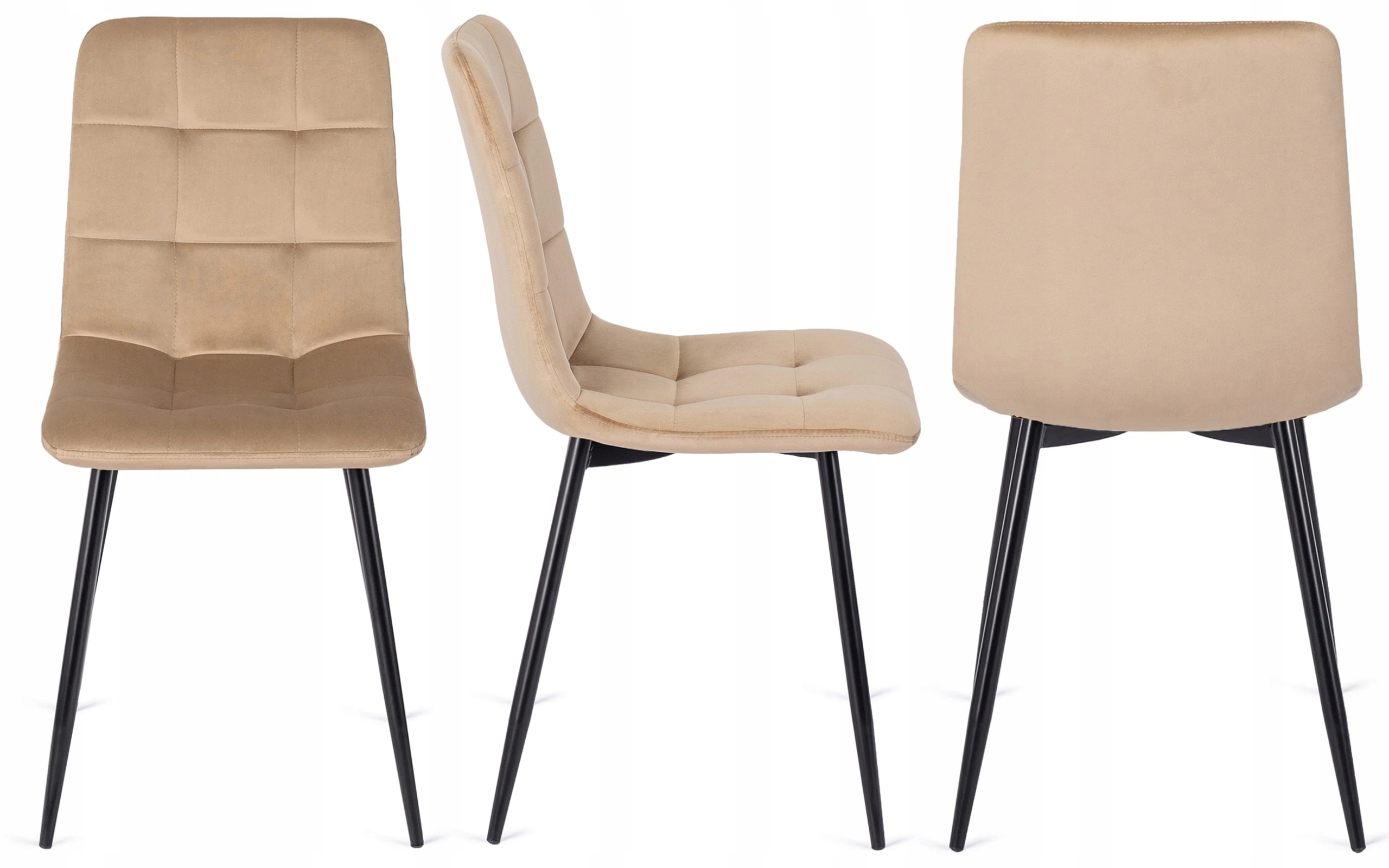 Krzesła mają metalowe nogi malowane proszkowo oraz miękkie siedzisko tapicerowane welurem w kolorze beżowym. Pikowania na oparciu podkreślają ich elegancki wygląd.