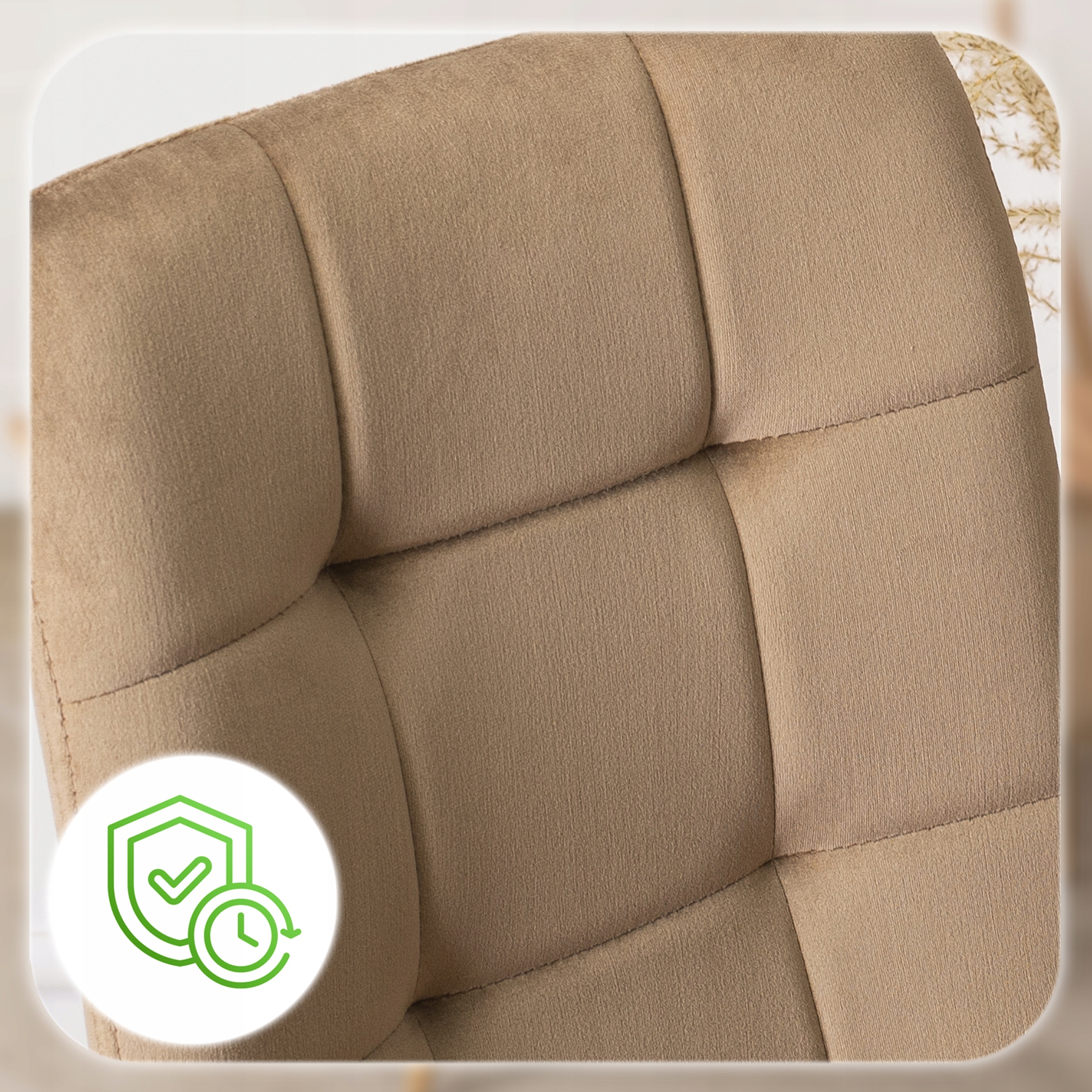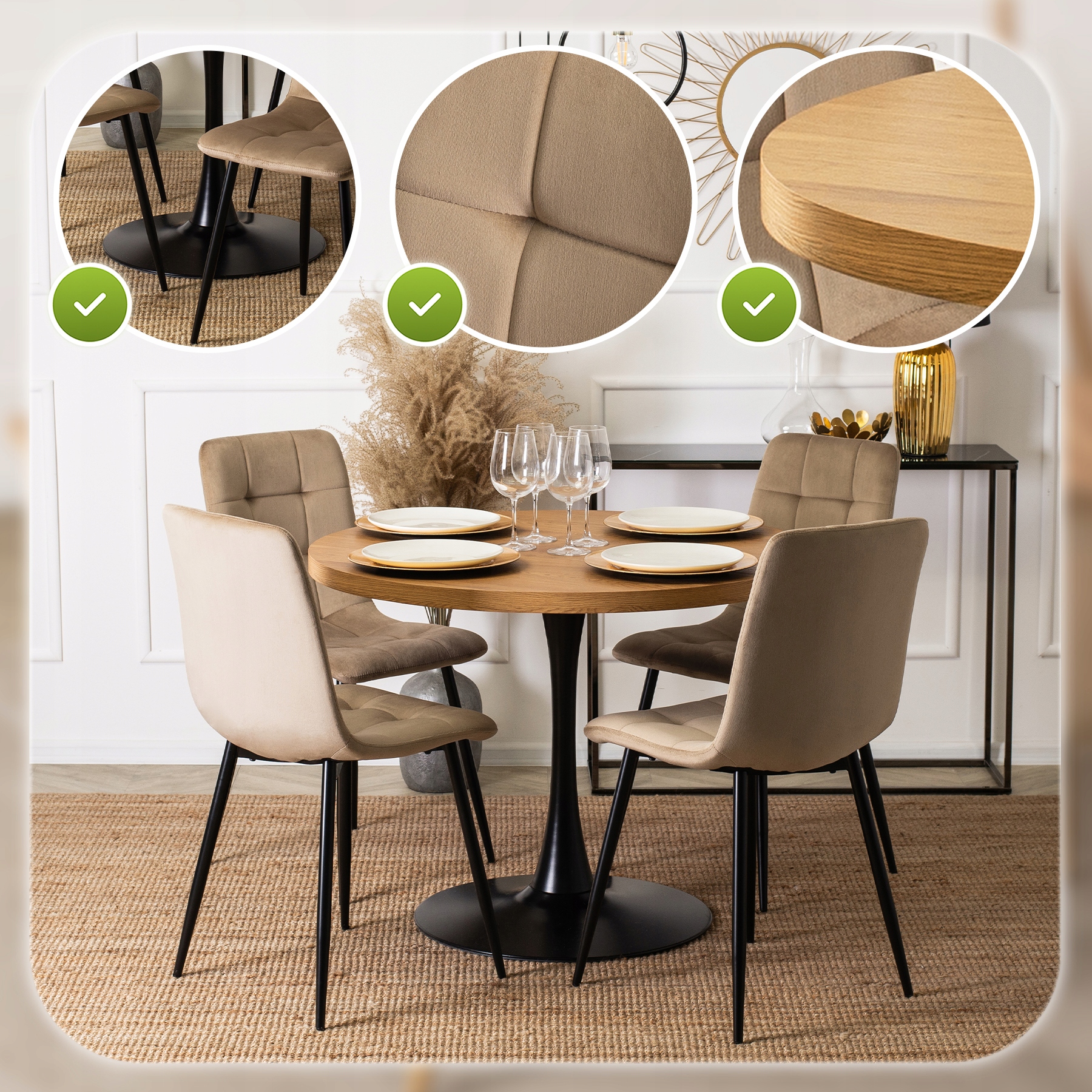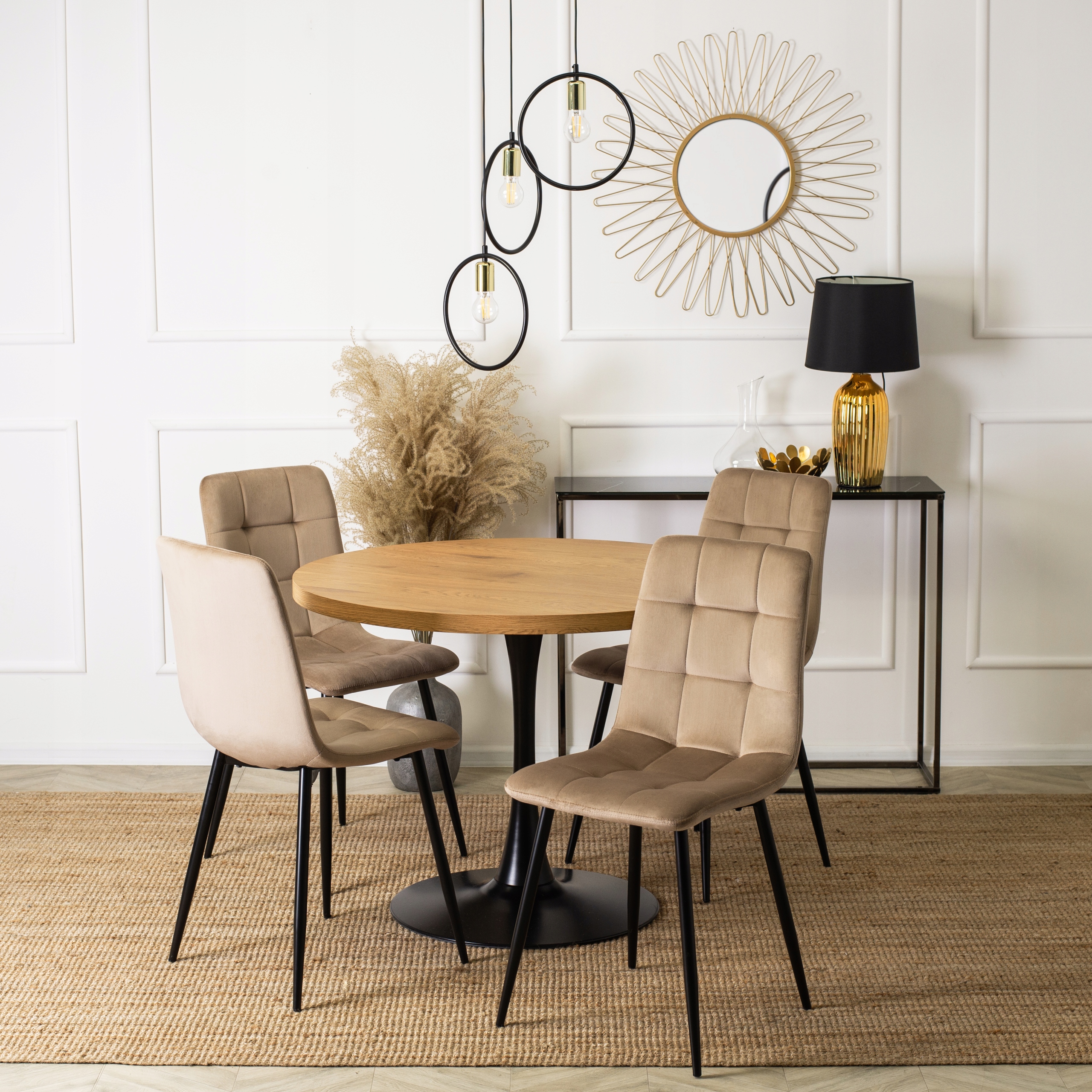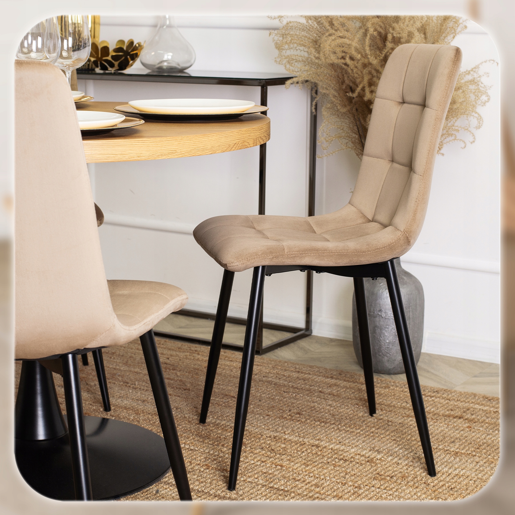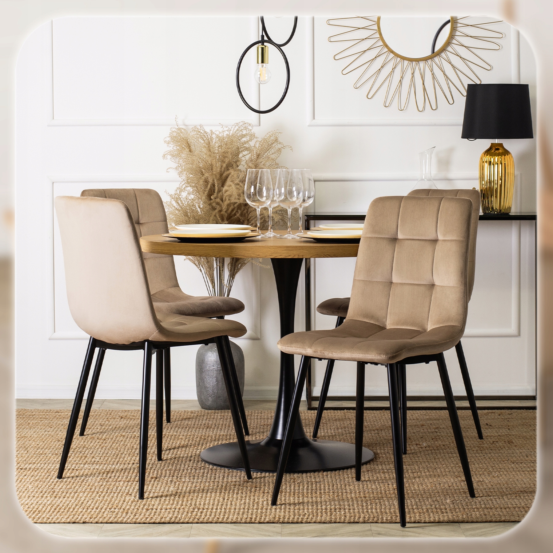 - KRZESŁA PERU - cztery krzesła tapicerowane welurem w beżowym kolorze zapewniają komfort i modny wygląd. Stabilne metalowe nogi gwarantują trwałość i spójny design ze stołem.