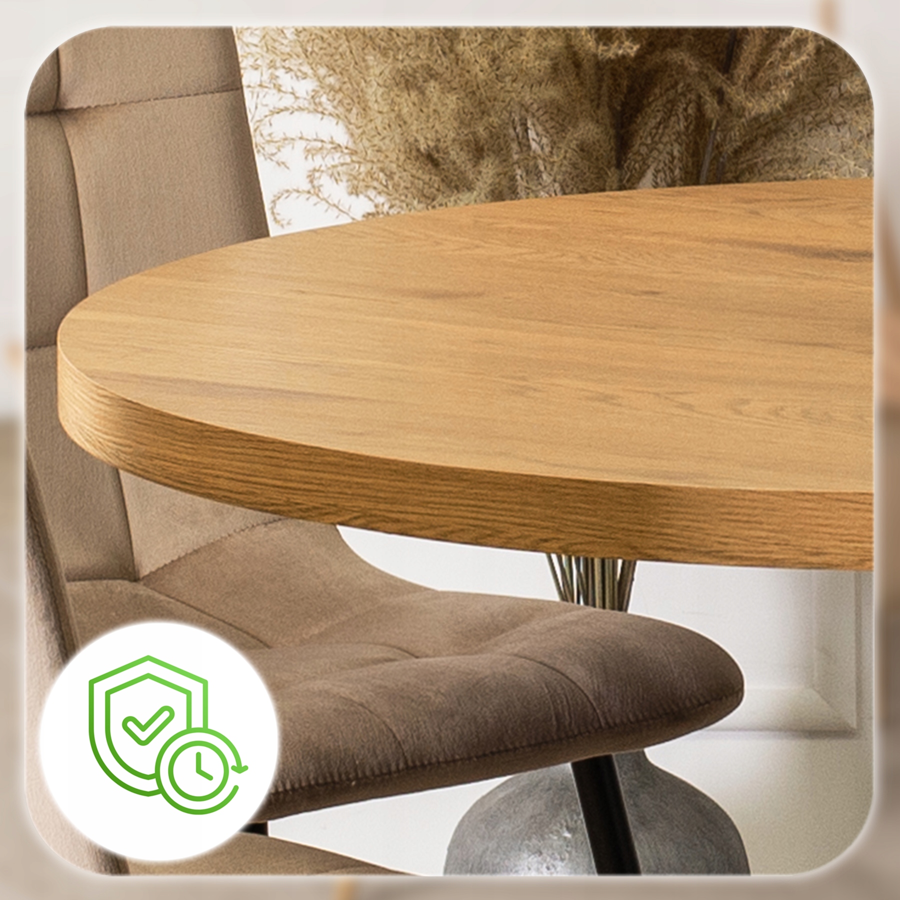 Blat stołu został wykonany z wytrzymałej, laminowanej płyty MDF w kolorze złotego dębu. Wygląda bardzo stylowo, jest solidny i łatwy w czyszczeniu. Bardzo wysoka jakość wykonania z dbałością o detale sprawia, że wzór drewna wygląda perfekcyjnie.