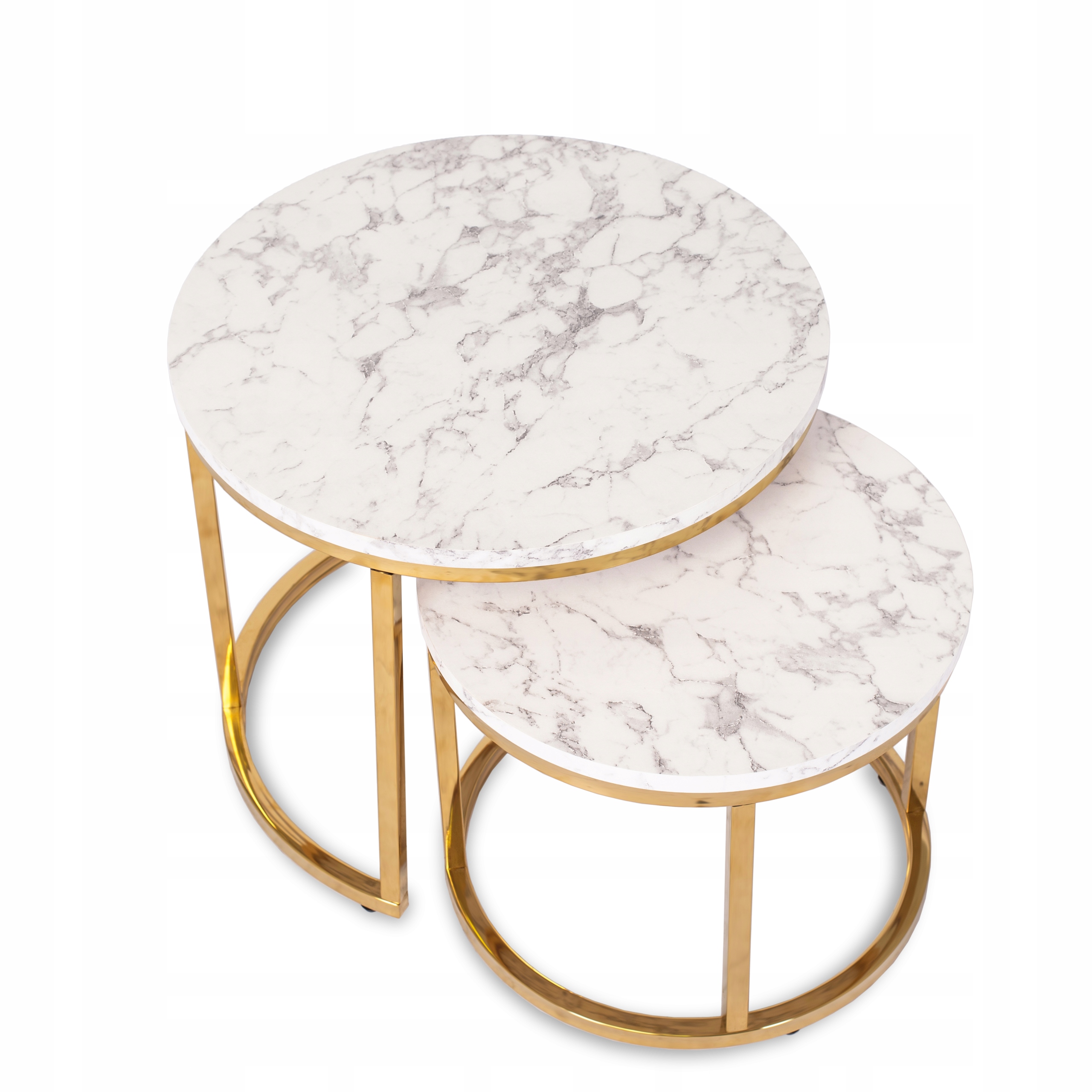 Blaty stolików zostały wykonane z wysokiej jakości płyty MDF pokrytej warstwą okleiny z imitacją białego marmuru, co ma właściwości ochronne i estetyczne. Szczególnie dobrze będą pasowały do aranżacji w stylu glamour lub eleganckim lofcie.