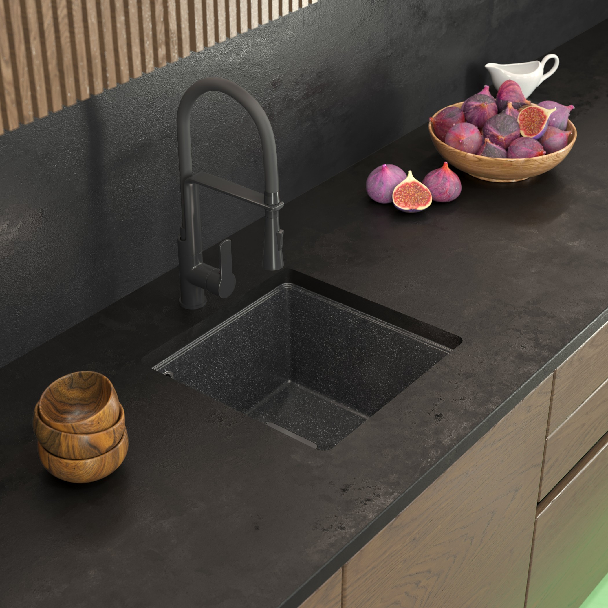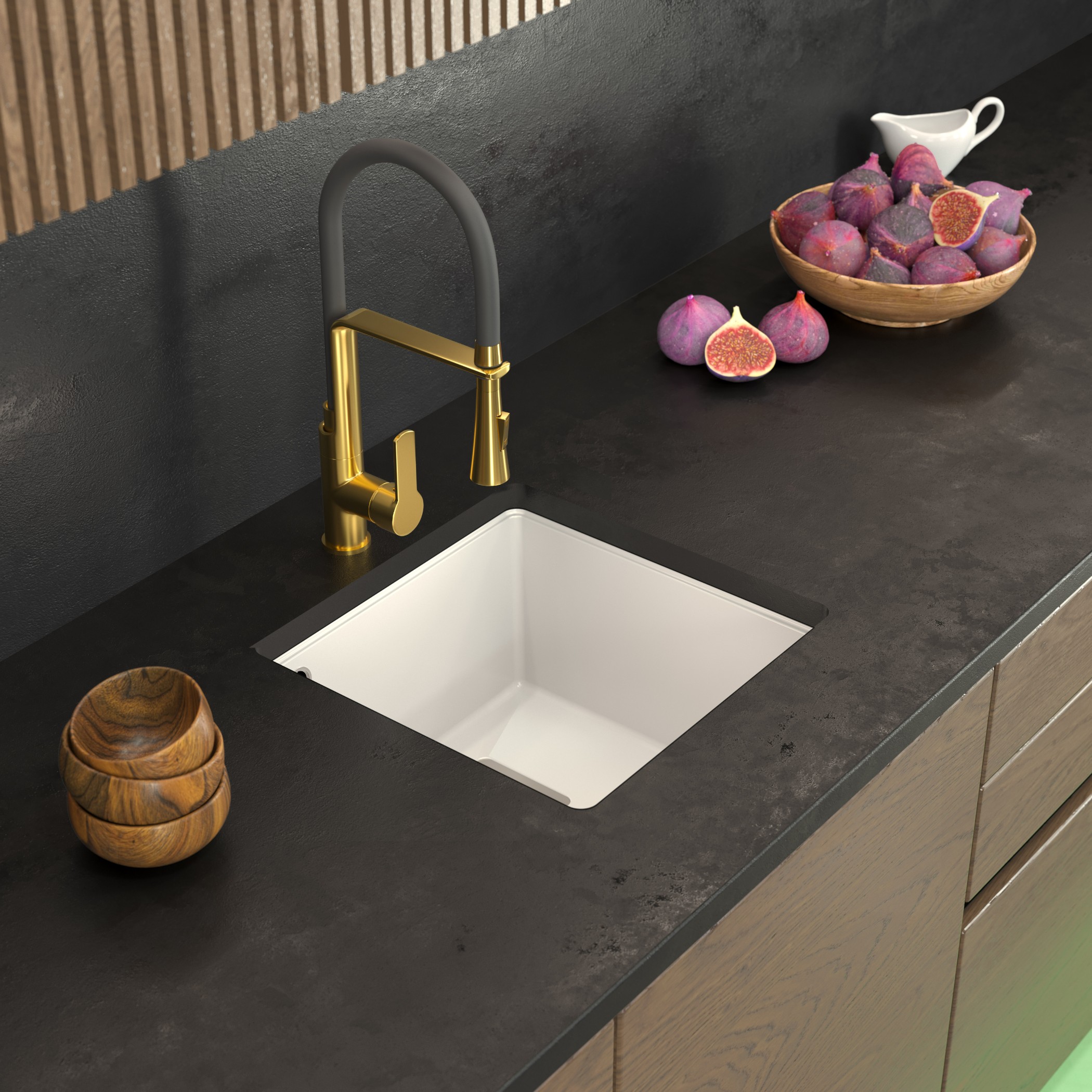 Klasyczny, geometryczny kształt w połączeniu z podblatowym systemem montażu sprawia, że zlew tworzy idealnie spójną powierzchnię z blatem kuchennym.