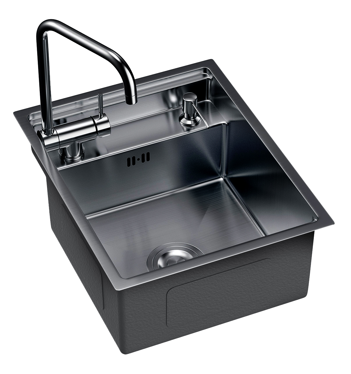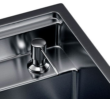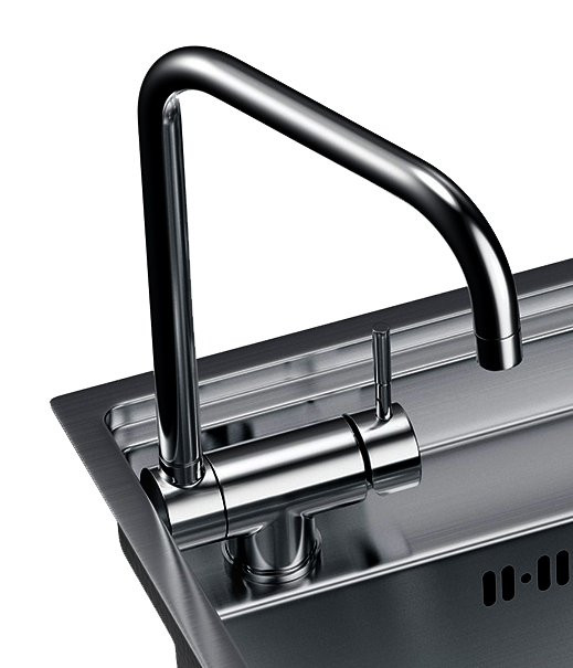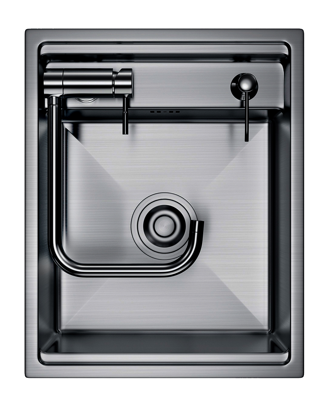 Zlewozmywak wyposażony jest w składaną baterię kuchenną, dozownik do płynu i syfon manualny z koszyczkiem na odpady.