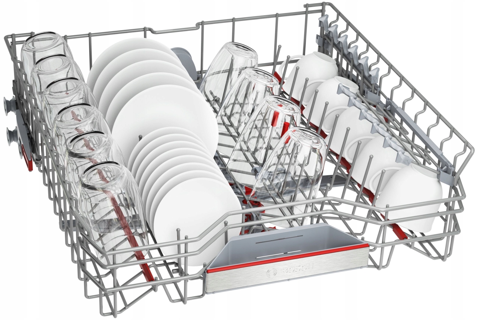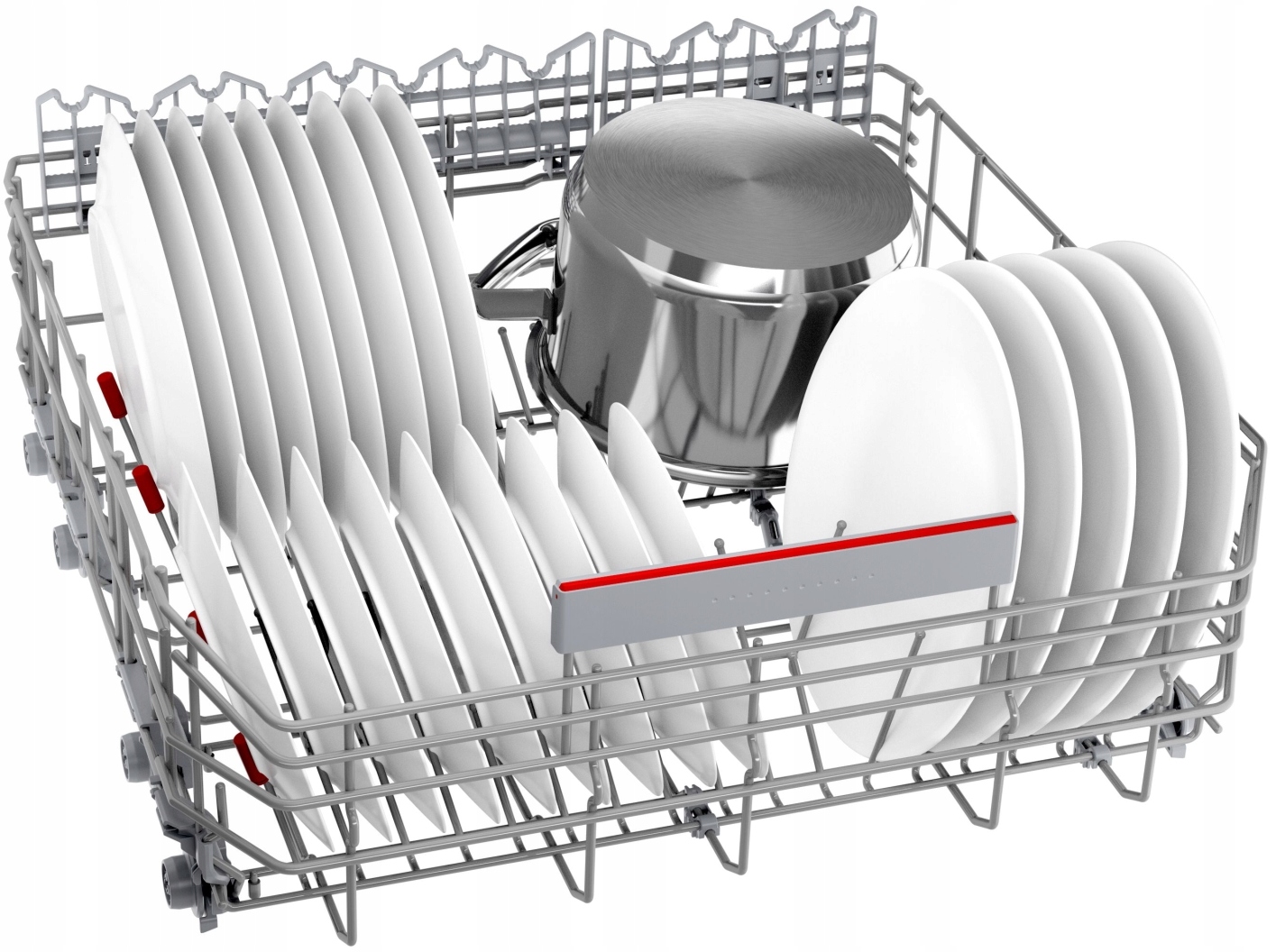 System regulacji położenia górnego kosza Rackmatic, służy dopasowaniu wnętrza do aktualnych potrzeb. System pozwala zmienić ustawienie kosza na różnych wysokościach, a wybraną pozycję można łatwo zmienić, nawet gdy kosz jest pełen. Dzięki temu możesz dostosować wnętrze do swoich potrzeb nawet dla bardzo wysokich talerzy w dolnym koszu, czy wysokich kieliszków czy kufli w górnym koszu.