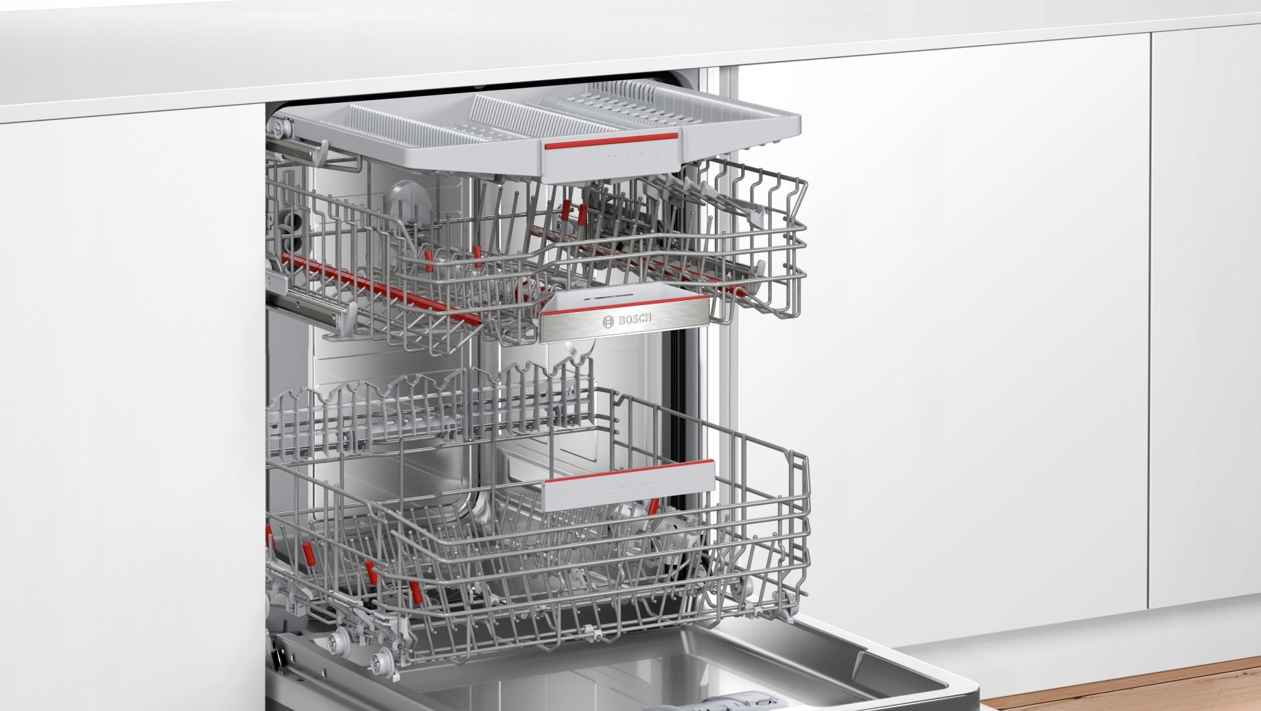 Odpowiedni załadunek różnorodnych naczyń może być wyzwaniem. Kosze MaxFlex oferują wiele możliwości załadunku dzięki stabilniejszemu, wyższemu dolnemu koszowi oraz składanym elementom na duże naczynia. Dodatkowo, nowo zaprojektowane uchwyty na kieliszki, antypoślizgowe wykończenie i półki na filiżanki zapewniają ich stabilizację. Dla małych akcesoriów kuchennych przewidziano u góry 3 poziom załadunku w postaci trzeciego kosza ExtraSpace albo szuflady na sztućce*. Kosze MaxFlex zapewniają bezpieczne ustawienie delikatnych szklanek i zapewniają wygodne umiejscowienie wszystkich naczyń! * w zależności od wyposażenia modelu