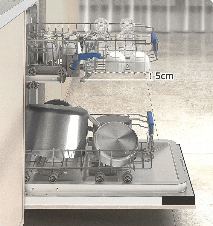 System pozwala na wygodną aranżację przestrzeni wnętrza zmywarki. Dzięki łatwej regulacji wysokości zawieszenia górnego kosza, zmywanie wysokich garnków, czy naczyń o nietypowym kształcie nie stanowi już problemu. Kosz można podnieść lub opuścić o 5 cm przy każdym zmywaniu.